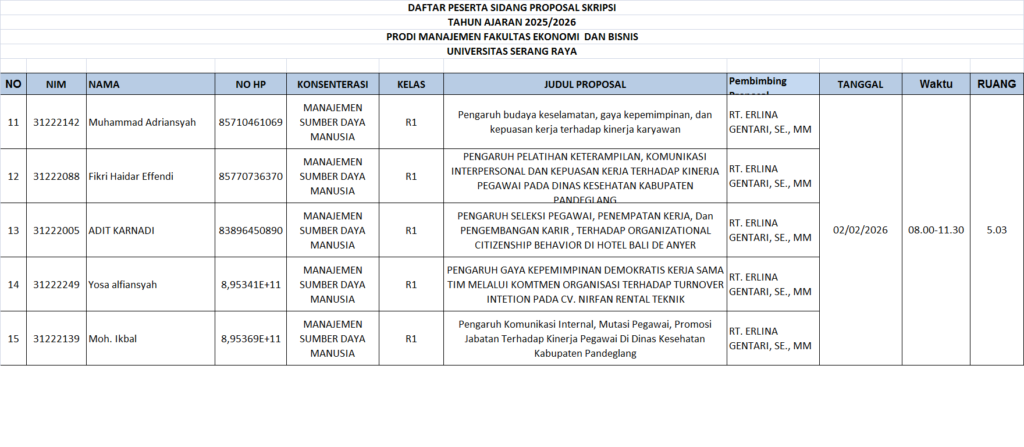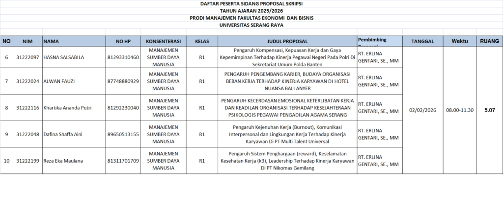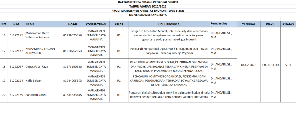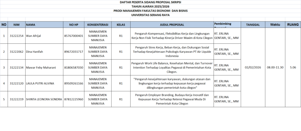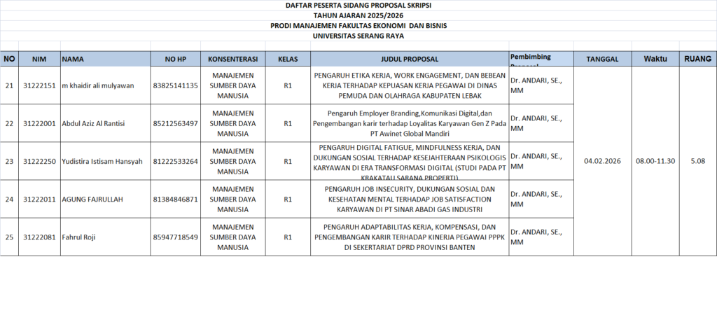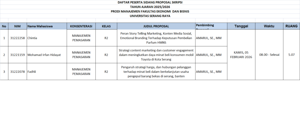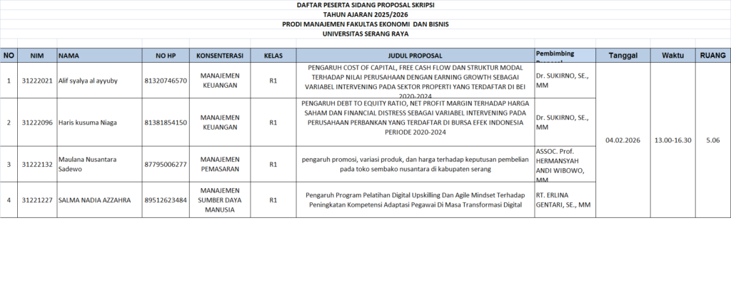 CATATAN : Peserta sidang diharuskan datang sebelum 30 menit waktu Sidang Proposal dimulai. Membawa Laptop masing-masing Dresscode : kemeja putih, jas almamater kuning , rok/celana bahan warna hitam, sepatu hitam. Post navigation PENGUMUMAN JADWAL SIDANG PROPOSAL SKRIPSI PRODI AKUNTANSI GEL 3 T.A 2025/2026 GANJIL PENGUMUMAN PENDAFTARAN SIDANG SKRIPSI GEL 2 TAHUN AKADEMIK 2025-2026 GANJIL PRODI AKUNTANSI DAN MANAJEMEN